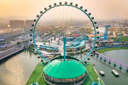建設(shè)總高度達(dá)88米,掛有42個(gè)太空艙。從遠(yuǎn)處看像是五彩繽紛的巨大風(fēng)車在緩緩轉(zhuǎn)動(dòng),又似一顆顆晶瑩的珍珠鑲嵌于大轉(zhuǎn)盤之上。