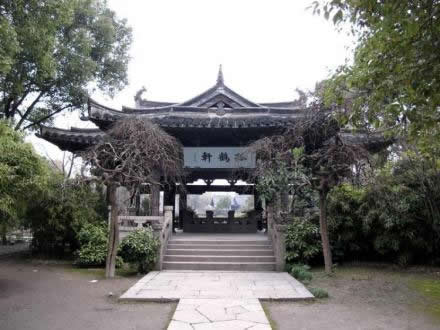 孤鶴軒位于沈園中部,是新辟建園林部分的景觀中心。北臨大荷花池宋池,與東北邊濱水小榭逼遙相對,西邊緊靠六朝井,南邊是遺物壁和明池。軒為單檐歇山頂兩面帶廊的敞廳,平面為倒“凸”字形,寬而臨水。構(gòu)架為仿宋式木構(gòu),下為青石欄板圍起的挑空平臺,造型秀麗曲雅。孤鶴軒亦稱“孤鶴哀鳴”處,是陸放翁的自喻。偉大愛國詩人陸游因南宋朝廷昏庸,壯志難以實現(xiàn),發(fā)出孤鶴的哀鳴,以孤鶴自喻,隱喻詩人在人生中痛失伴侶,事業(yè)上報國無門、愛民有罪、屢遭貶職的坎坷一生。亭內(nèi)有“亭池”遺址,1985年考古發(fā)掘時在此發(fā)現(xiàn)唐亭閣和明代的假山、魚池遺址!肮满Q軒”匾額分為內(nèi)外兩塊,內(nèi)匾額由著名書畫家、文物鑒定家謝稚柳題寫,亭外由大康敬書。