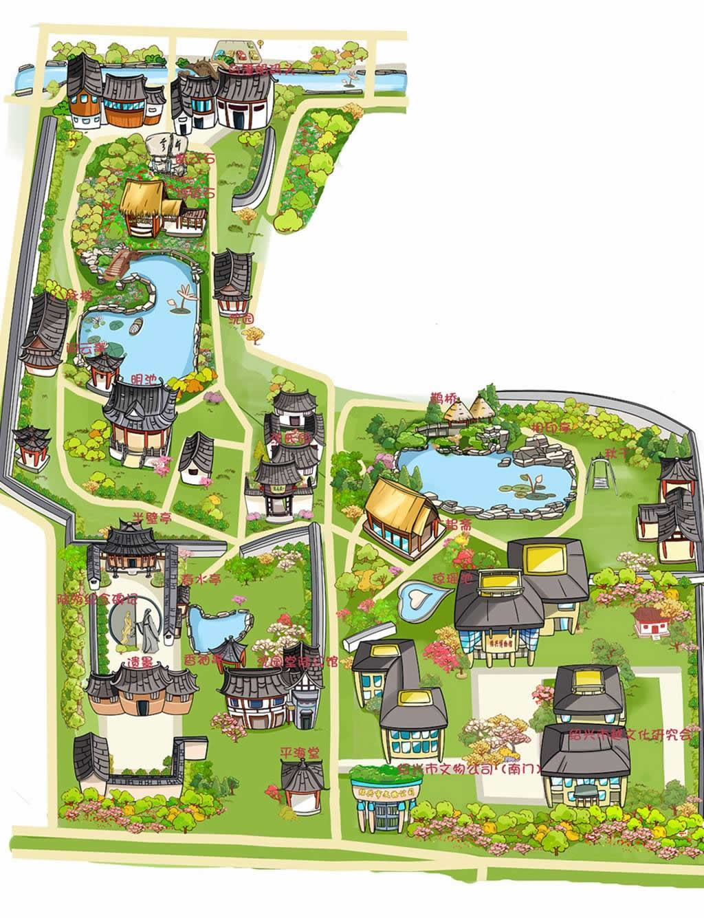 植物:沈園共有68種植物,包括了喬木、灌木、藤本和水生植物各個類別。種植密度以東苑和北苑較大,主要用來對苑內(nèi)空曠地帶進行補充,彌補線路上建筑數(shù)量少而在立面和平面上形成的空隙;東苑還設置了一小塊杉木林帶,疏密相間。