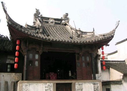 修真觀古戲臺(tái)是道觀的附屬建筑,建于清乾隆十四年(1749),與修真觀一樣屢遭毀損,但民國八年(1919)年修繕后,便一直保持至今。戲臺(tái)占地204平方米,北隔觀前街與修真觀相對(duì),南臨東市河,東倚興華橋。戲臺(tái)為歇山式屋頂,飛檐翹角,莊重中透著秀逸。梁柱之間的雀替均為精致的木雕,藝術(shù)價(jià)值極高。臺(tái)為兩層,底層用磚石圍砌 ,進(jìn)出有邊門和前門。邊門通河埠,底層后部有小梯通樓臺(tái),亦可通過翻板門從河埠下到船里。樓臺(tái)分前后兩部分,后部是化妝室,雕花矮窗,寬敞明亮;前部是戲臺(tái),正對(duì)廣場(chǎng)。