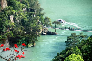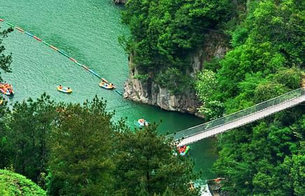 過(guò)龍?zhí),潭水平和,為峽谷漂流的登筏之處;懸空橋由鋼索懸架而成,長(zhǎng)近70米,高逾40米,上橋行走,凌空晃蕩,不少游客會(huì)為之發(fā)怵心顫,給人以無(wú)窮刺激,有人稱之為“勇敢者橋”。五星橋頭設(shè)有山貨市場(chǎng),可供應(yīng)大峽谷內(nèi)的各種特產(chǎn)。